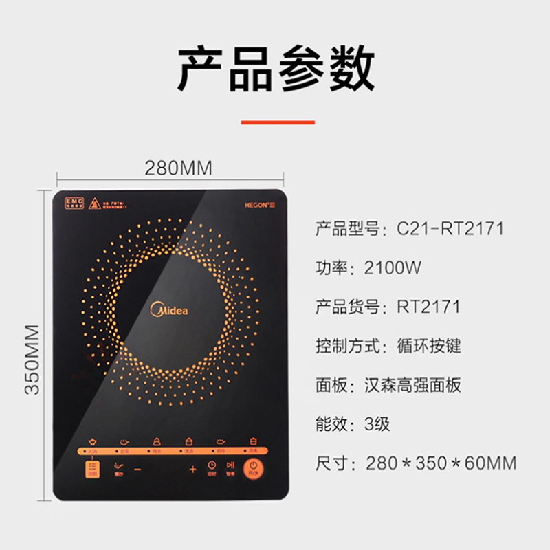 美的(Midea)电磁炉多功能大功率 触控黑晶面板【汉森高强面板/橙色】