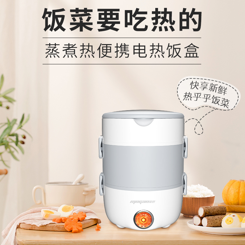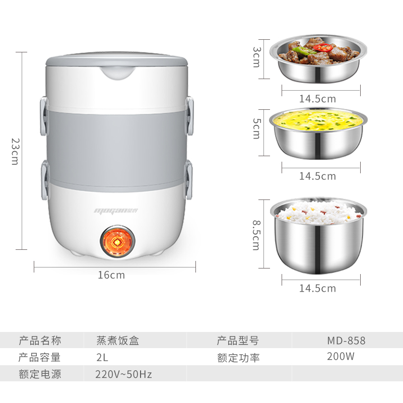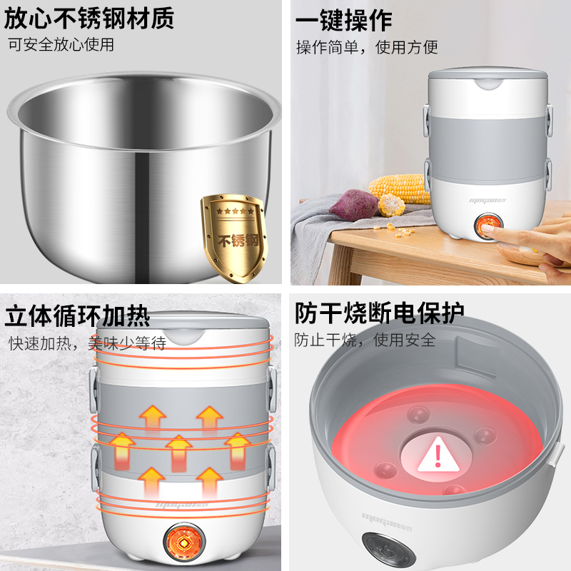 大容量三层防干烧自动断电电热饭盒【食品级不锈钢/白色】