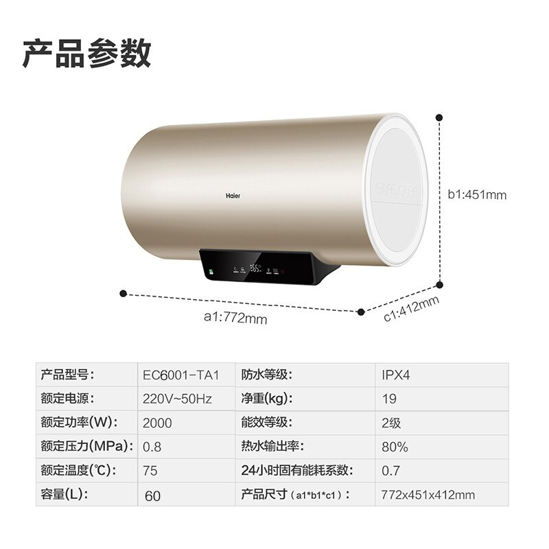 Haier/海尔 EC6001-TA1系列炫金机身储水即热式红外远程遥控电热水器 超短型热水器【炫彩机身/金色】