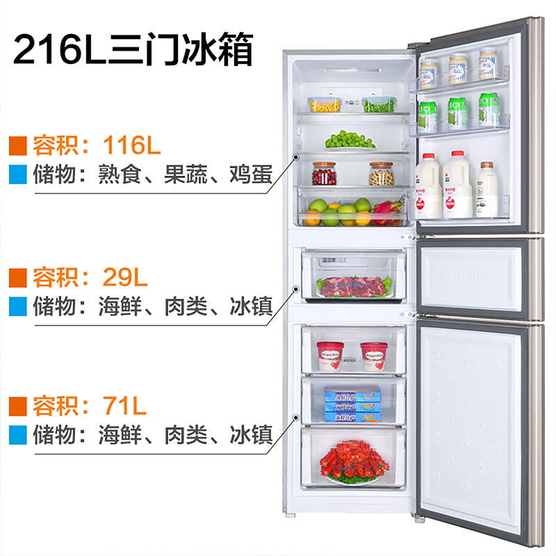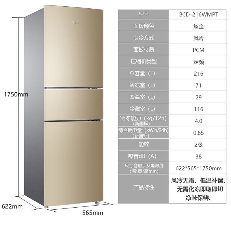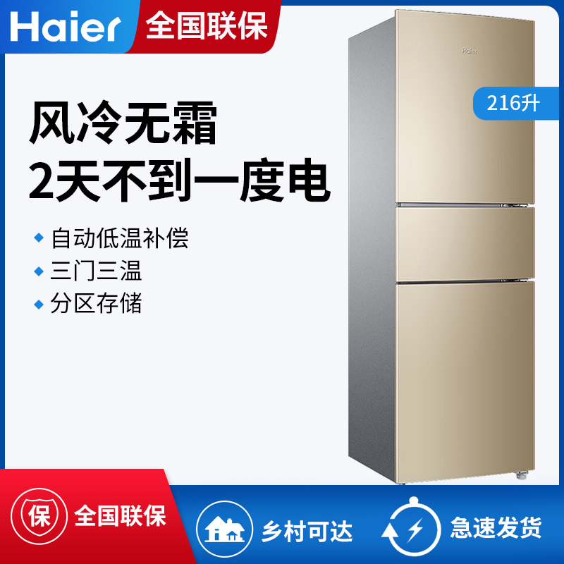 Haier/海尔 BCD-216WMPT家用小型三门多门风冷无霜节能静音电冰箱【PCM彩涂板/炫金】
