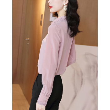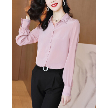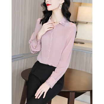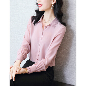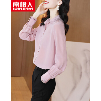 南极人 衬衫女长袖2020秋季新款韩版时尚宽松女装衬衣气质翻领蕾丝勾花刺绣小衫上衣潮 粉色 M
