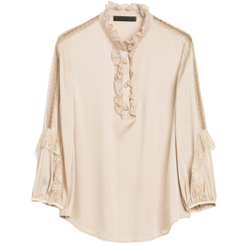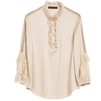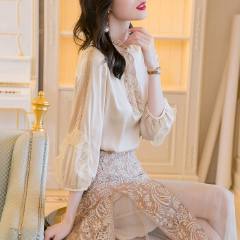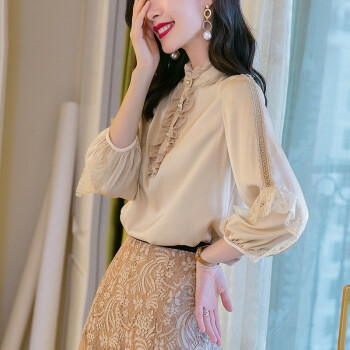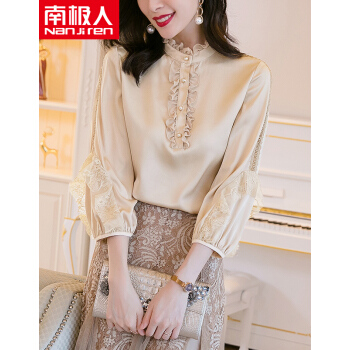 衬衫>>南极人 衬衫女2020夏季新款长袖女装衬衣韩版时尚木耳边立领镂空蕾丝拼接上衣潮 N4-DGB405-6890-香槟色 M
