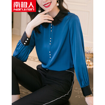 衬衫>>南极人 长袖衬衫女2020夏季新款女装时尚撞色绣花娃娃领衬衣原创设计纯色打底小衫上衣潮 N4-NRB42-5269-蓝色 M