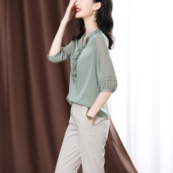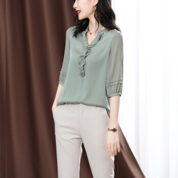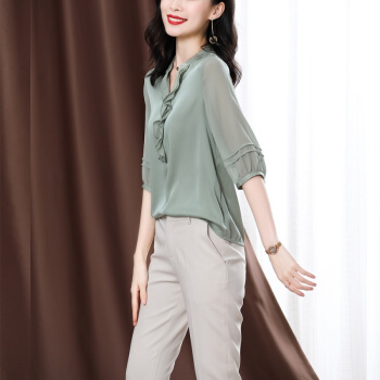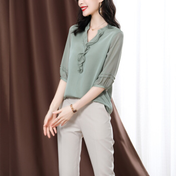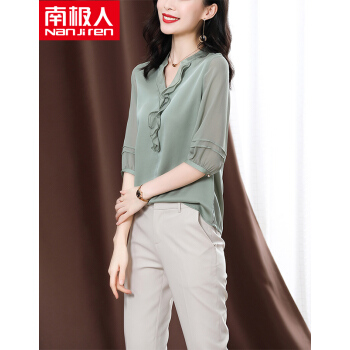 衬衫>>南极人 衬衫女短袖衬衣2020夏季新款女装雪纺小衫韩版时尚气质木耳边V领宽松上衣潮 N4-NRE233-1004-果绿 L