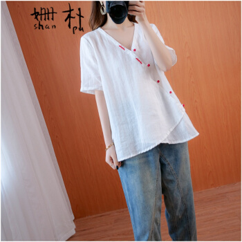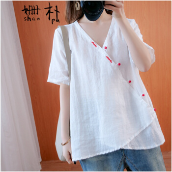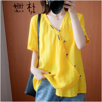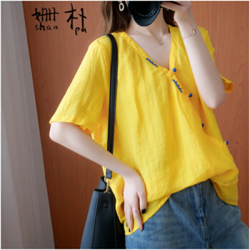 姗朴 棉麻衬衫女民族风2020夏季新款文艺复古大码女装胖mmV领盘扣宽松显瘦斜襟休闲短袖T恤上衣女 黄色 大码均码