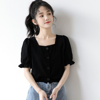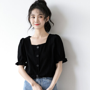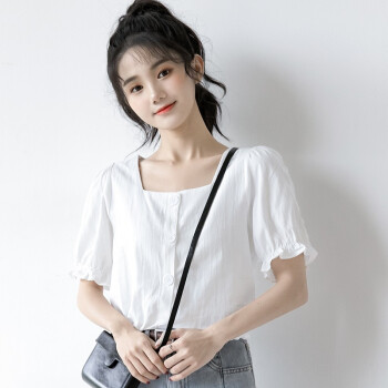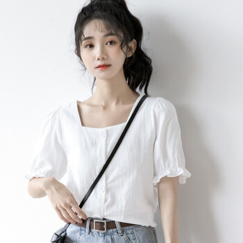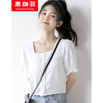 惠珈芸短袖衬衫女2020夏季新款很仙的法式泡泡袖上衣女小众设计感白色衬衫韩版法式复古方领t恤衬衣女潮 白色 此码勿拍.请拍自身对应码数