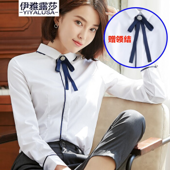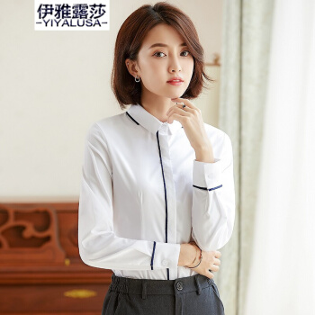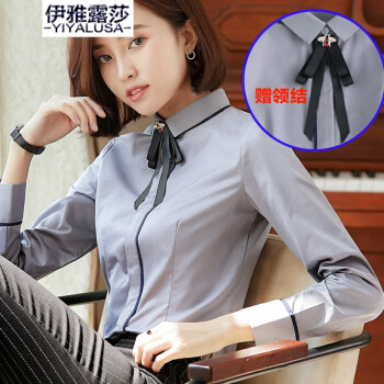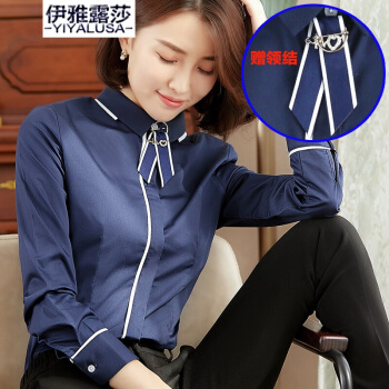 伊雅露莎长袖衬衣女商务通勤棉质职业装衬衫防走光暗扣大学生面试工作服923-1 单件深蓝衬衫 L