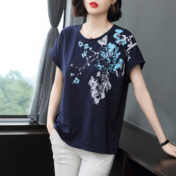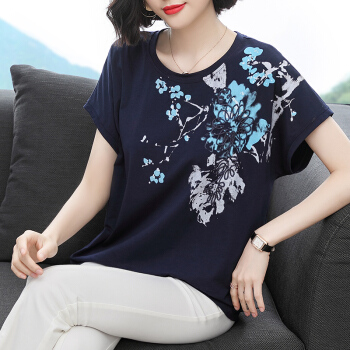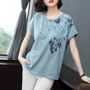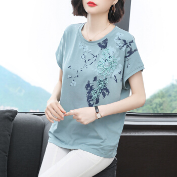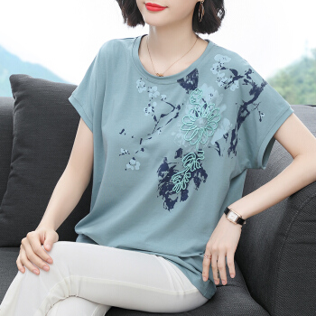 红粉宣言2020夏季新款百搭宽松纯棉短袖T恤女大码碎花中年妈妈装 浅绿色 L