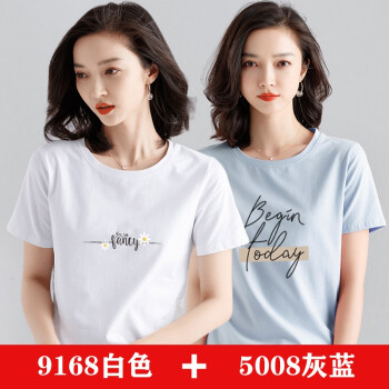 短袖T恤>>【两件装】知语者女装短袖t恤女宽松体恤大码显瘦上衣2020夏季新款百搭韩版印花时尚纯棉打底衫T恤女 9168白色+5008粉色 L《105-115斤》