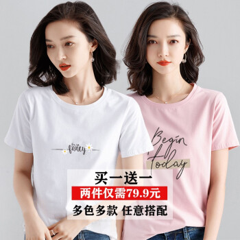 【两件装】知语者女装短袖t恤女宽松体恤大码显瘦上衣2020夏季新款百搭韩版印花时尚纯棉打底衫T恤女 9168白色+5008粉色 L《105-115斤》 |