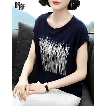 【精选好货】晞薇短袖t恤女2020新款夏装纯棉上衣宽松舒适印花上衣衫半袖小衫中年妈妈女士体桖夏 深蓝色 M |