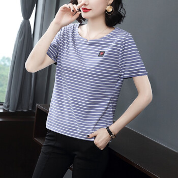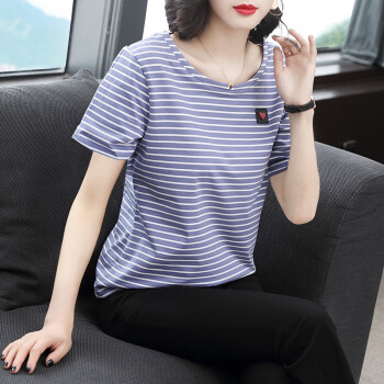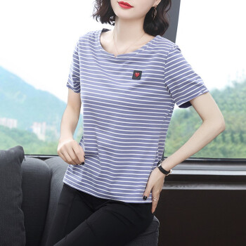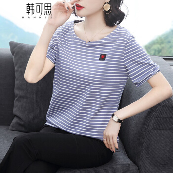 短袖T恤>>【精选好货】韩可思条纹短袖t恤女2020夏季新款韩版宽松百搭中年妈妈大码女装简约半袖蓝色上衣 蓝色 请拍正确尺码