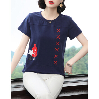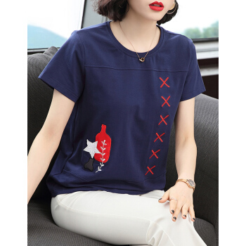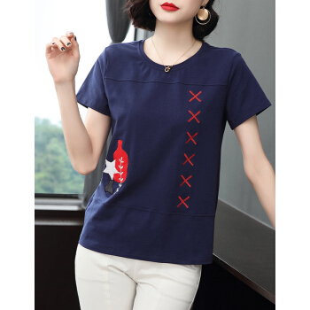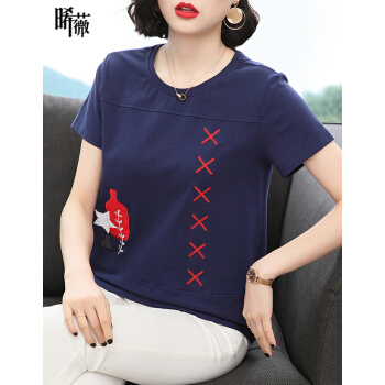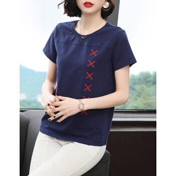 【精选好货】晞薇妈妈夏装小衫T恤短袖女2020新款中年妇女大码女装显瘦遮肚体桖棉宽松休闲上衣女 深蓝色 请拍正确尺码