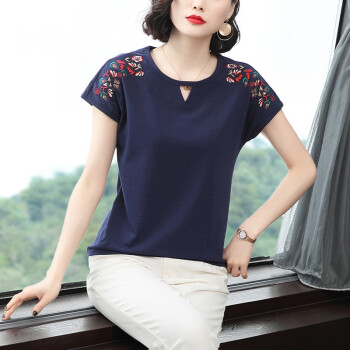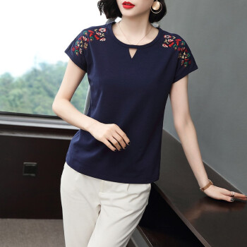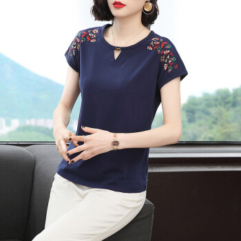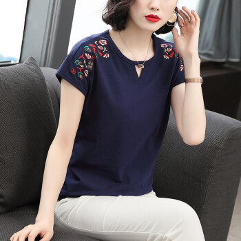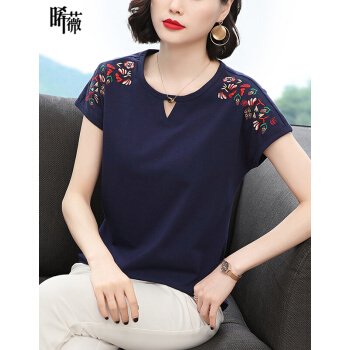 短袖T恤>>【精选好货】晞薇棉短袖t恤女2020新款夏季时尚显瘦碎花半袖上衣宽松刺绣中年妈妈女装t桖 深蓝色 请拍正确尺码