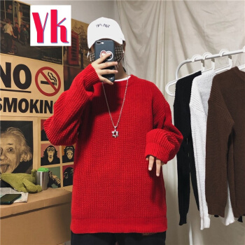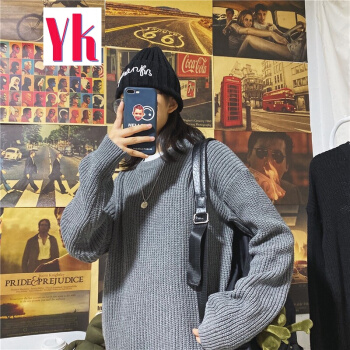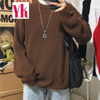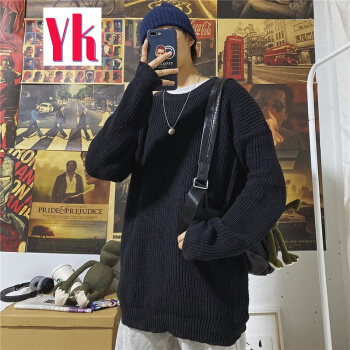港风潮流ins慵懒风毛线衣情侣纯色圆领针织衫韩版宽松学生毛衣男 黑色 M