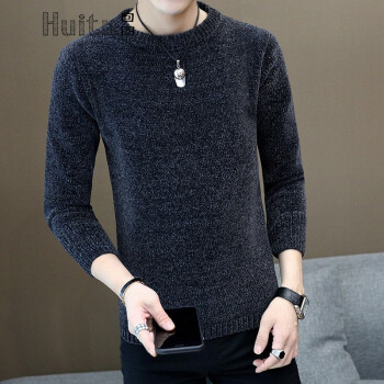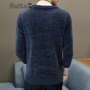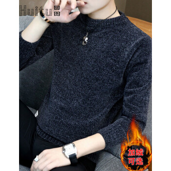 回图 秋冬季毛衣男圆领雪尼尔加绒加厚款毛衫半高领针织衫韩版潮流修身冬装衣服纯色长袖t恤情侣男装毛线衣 深灰蓝色 XL