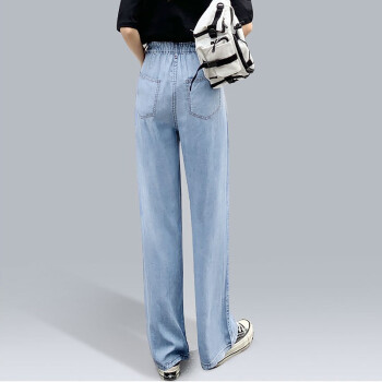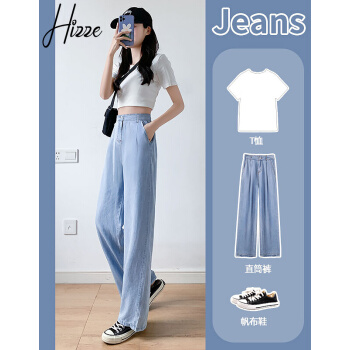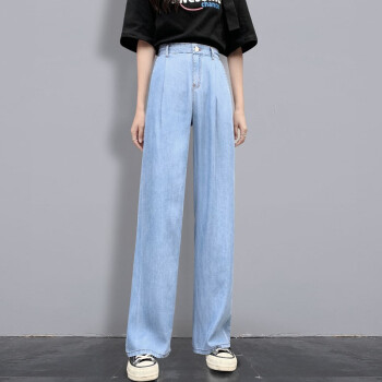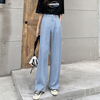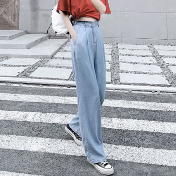 【精选女裤】Hizze天丝牛仔阔腿裤女裤子2020夏季新款薄款宽松百搭直筒高腰垂感冰丝超薄夏天长裤 复古蓝【拖地裤】 请拍正确尺码