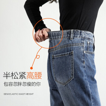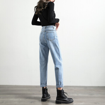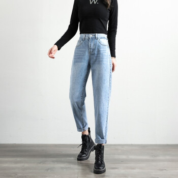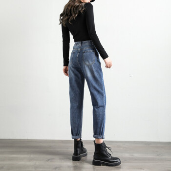 麦潮尚2020秋季新款松紧腰牛仔裤女高腰橡筋老爹裤显瘦哈伦裤子 复古蓝色 XXS建议70斤内