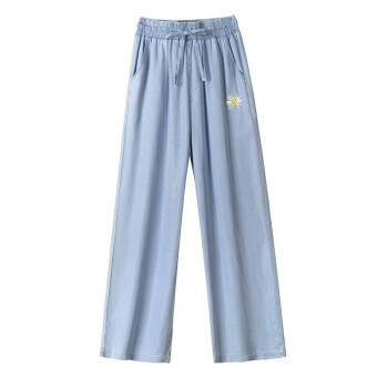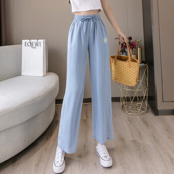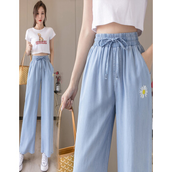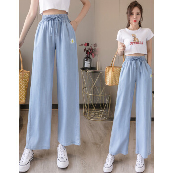 牛仔裤>>阅樱牛仔裤女冰丝 2020新款女裤夏松紧腰宽松大码休闲牛仔裤女垂感阔腿裤显瘦天丝裤子女薄款拖地裤子女 蓝色 L