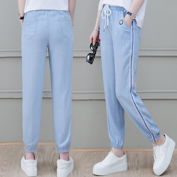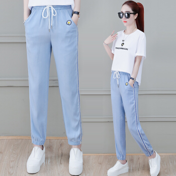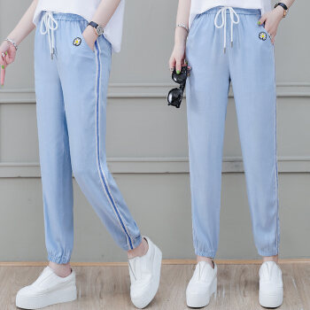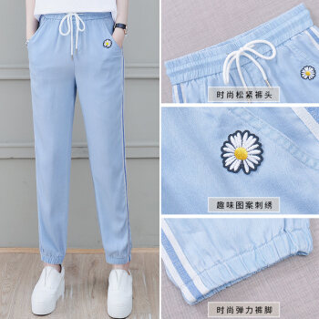 茉玥天丝小雏菊牛仔裤女夏季2020新款直筒松紧侧条纹运动休闲九分裤子 蓝色 请拍正确尺码