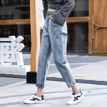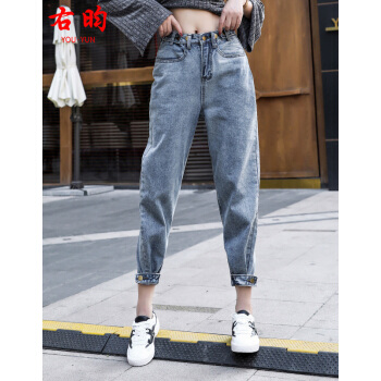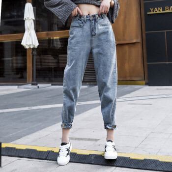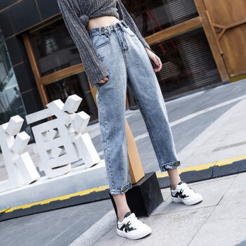 【2件特价】右昀 牛仔裤女2020夏季薄款九分老爹裤子新高腰网红泫雅宽松哈伦春秋萝卜潮 7768浅蓝色 L【适合110-120斤】