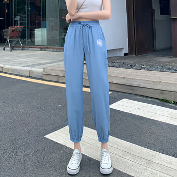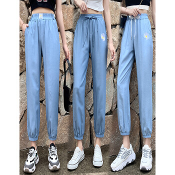 五个橘子牛仔裤女冰丝 2020新款女裤夏薄韩版宽松大码学生小雏菊九分裤女束脚裤高腰天丝休闲哈伦裤垮裤 无抽绳 L