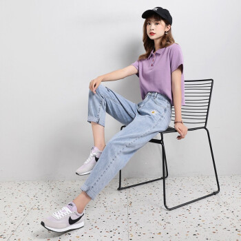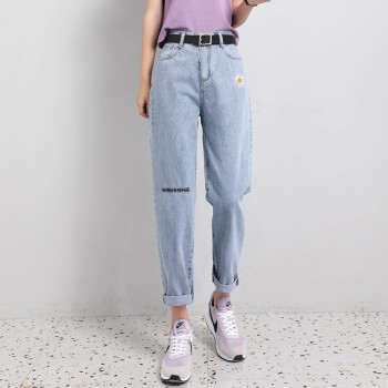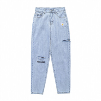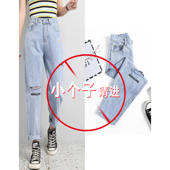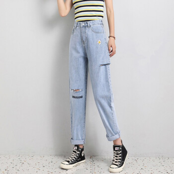 牛仔裤>>阅樱破洞牛仔裤女夏薄2020新款女裤高腰直筒九分裤女宽松大码胖妹妹显瘦老爹裤萝卜裤垮裤学生小雏菊裤子 破洞款 L
