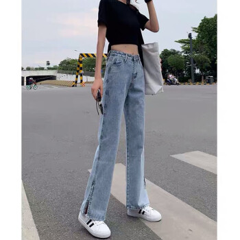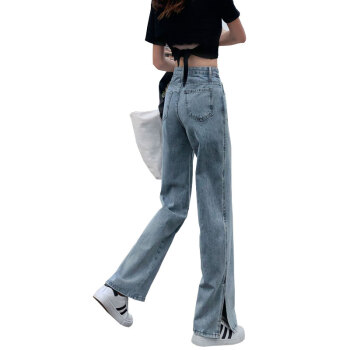 丝克诺依 牛仔裤女阔腿裤夏季薄款2020新款浅色开叉直筒宽松泫雅风高腰垂感拖地裤潮 浅蓝长裤 M