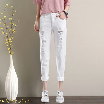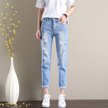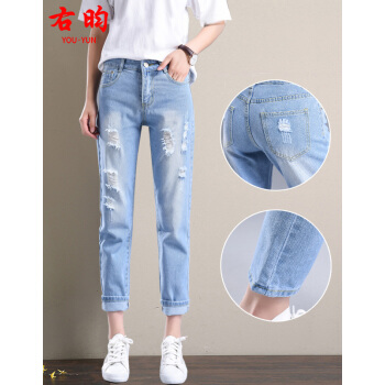 【2件特价】右昀 高腰破洞牛仔裤女宽松春秋2020新款显瘦百搭学生九分哈伦萝卜裤子 浅蓝色 28【适合100-110斤】