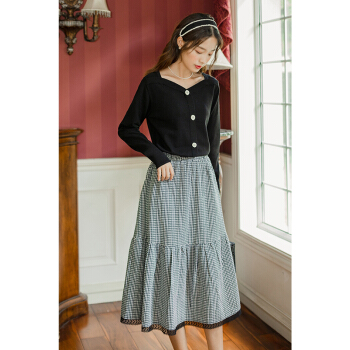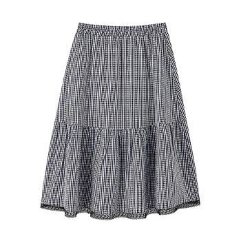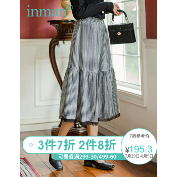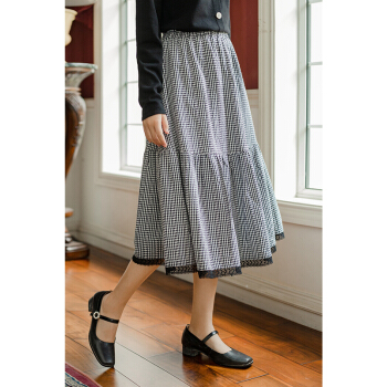 半身裙>>茵曼2020秋装新款松紧高腰A字中长款学院花边文艺复古格子半身裙【F1803571】 黑格 L