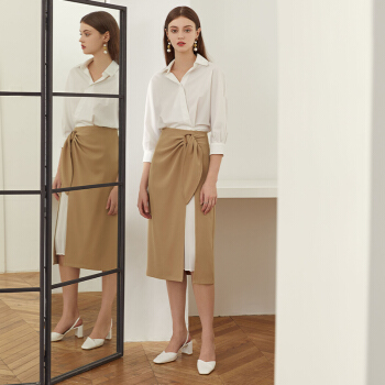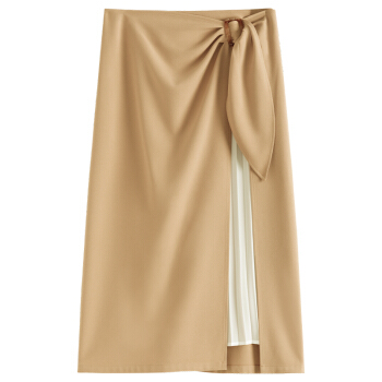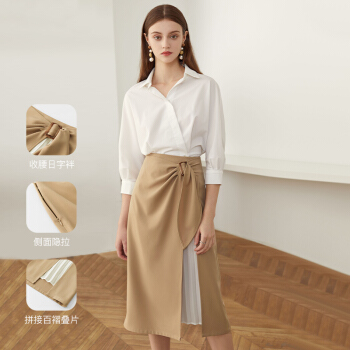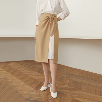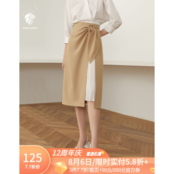 范思蓝恩 2020夏季新款不规则半身裙气质百褶裙女中长款高腰a字裙 驼色 M |