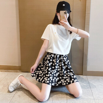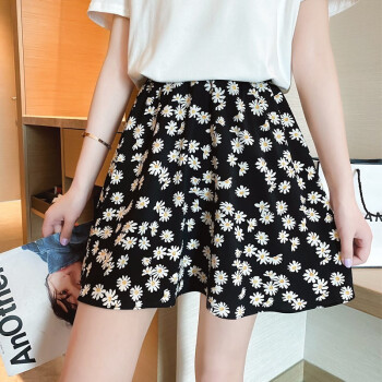 浪莎裙子女 女夏季高腰半身裙碎花中裙a字中长款黑色显瘦雪纺小雏菊短裙 短裙 L建议85-120斤
