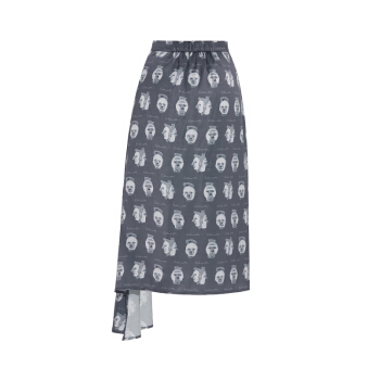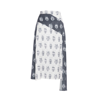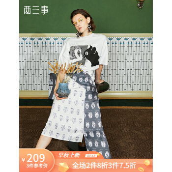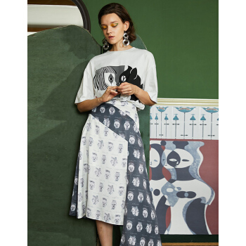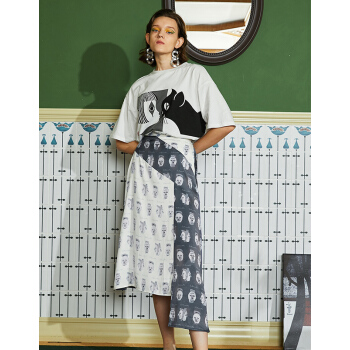 【商场同款】两三事 白日叠影 2020夏季新款复古撞色头像印花不规则高腰半身裙 拼色 M