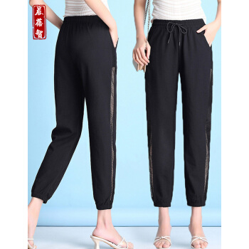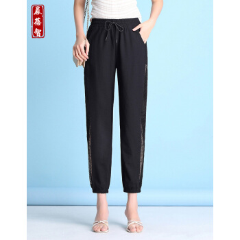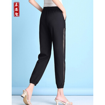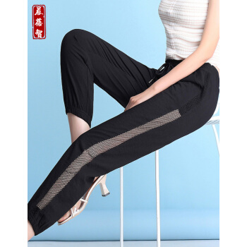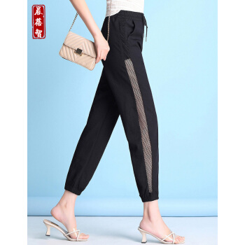 休闲裤>>晨蓓智cbz休闲裤女2020夏季冰丝棉麻网纱拼接宽松大码女装百搭哈伦裤高腰九分运动小脚裤显瘦薄款 黑色 M【建议85-103斤】