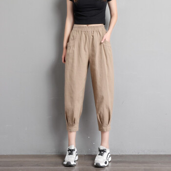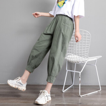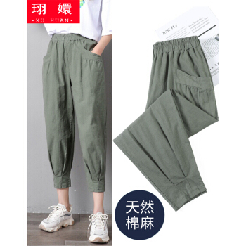 珝嬛棉麻休闲裤女七分哈伦裤子2020新款学生胖mm高腰宽松显瘦夏季亚麻工装灯笼裤女薄款运动裤大码女装 军绿色 此码勿拍.请拍自身对应码数