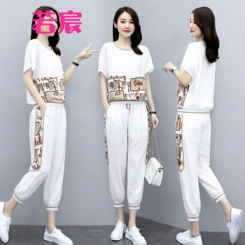 若宸两件套套装女2020夏休闲裤女运动九分时尚束脚裤大码女装冰丝裤子 白色 M |