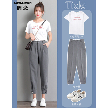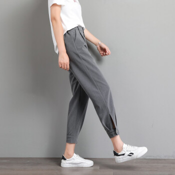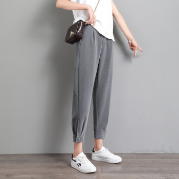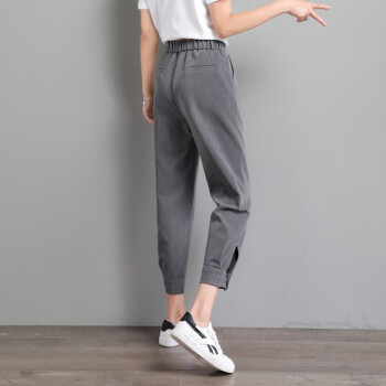 休闲裤>>阔恋冰丝休闲裤女夏季薄款束脚西装裤2020新品直筒宽松高腰哈伦裤子百搭显瘦九分裤韩版松紧腰萝卜女裤 灰色 M