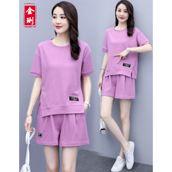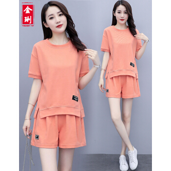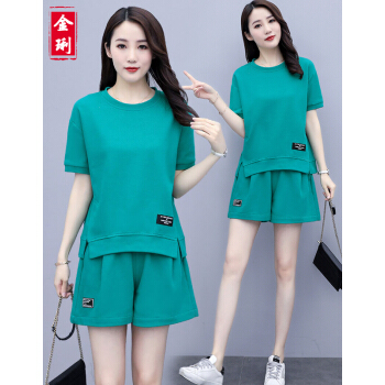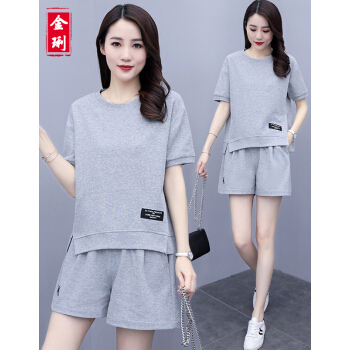 金琍JL短裤女休闲套装女2020夏季新款圆领短袖上衣短裤套装学生宽松晨练跑步大码女装减龄显瘦两件套 海蓝色 L【建议90-110斤】