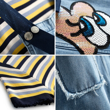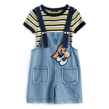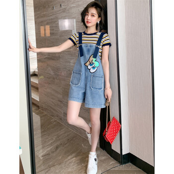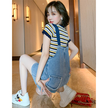 乐佐妮短裤女套装牛仔背带裤2020夏季新款条纹短袖T恤两件套阔腿裤 条纹+牛仔蓝 S