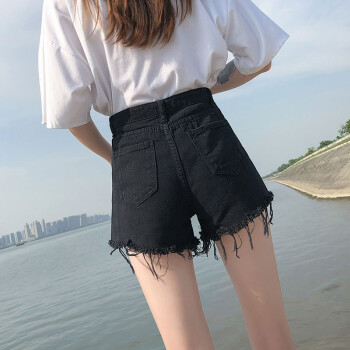 沫澜仟衣黑色破洞牛仔短裤女阔腿宽松高腰显瘦2020夏季薄款潮流时尚加大码胖mma字热裤 黑色 26码