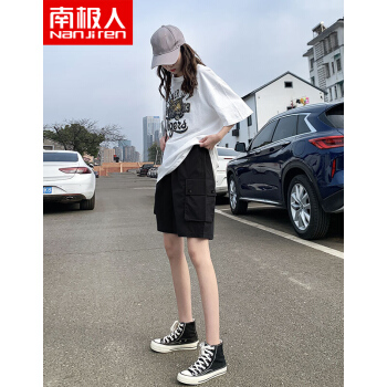 短裤>>南极人 五分工装短裤女宽松2020年新款夏季薄款高腰百搭休闲裤运动中裤潮ins YYR867 带扣黑色 请拍正确尺码