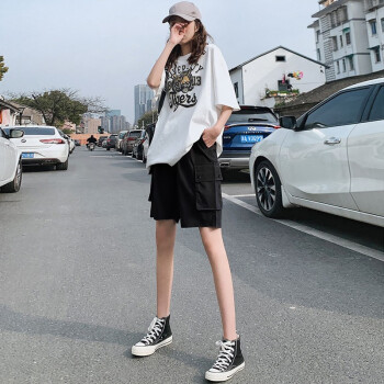 南极人 五分工装短裤女宽松2020年新款夏季薄款高腰百搭休闲裤运动中裤潮ins YYR867 带扣黑色 请拍正确尺码 |