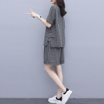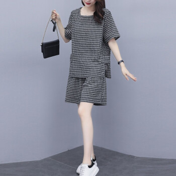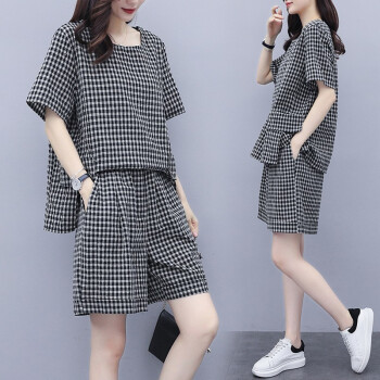 伊轩坊短裤女夏2020新款大码女装韩版宽松显瘦洋气减龄格子休闲时尚套装女两件套 格子套装 L