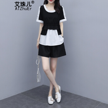 艾珠儿 短裤女2020夏季新款女装休闲运动棉麻两件套大码宽松显瘦阔腿短裤时尚套装女 黑白 短裤套装 M |