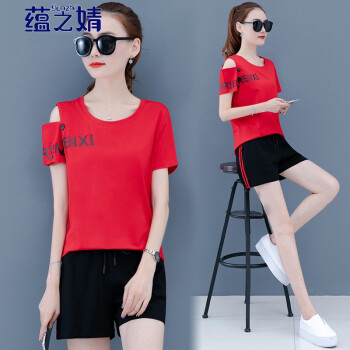 短裤>>蕴之婧 2020新款运动休闲套装女大码女装夏韩版宽松ins潮显瘦小个子棉两件套短袖T恤短裤女 宝蓝 L(建议90-105斤左右)