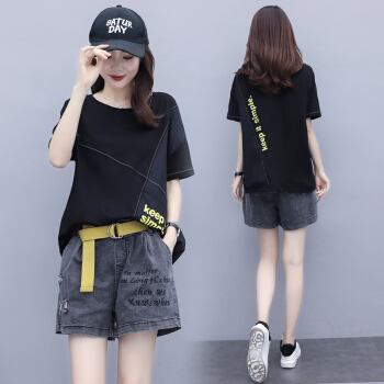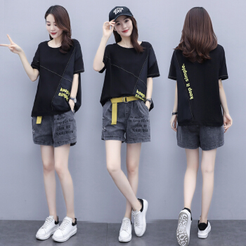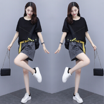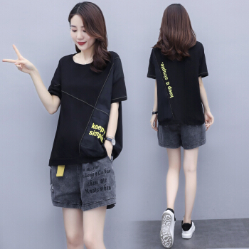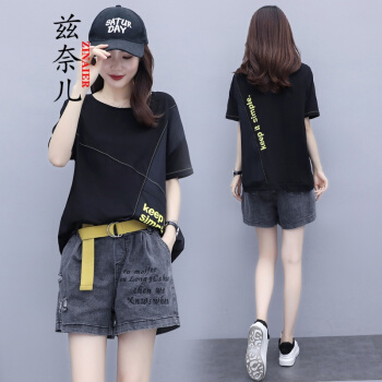 兹奈儿2020年夏季新款时尚印花百搭潮流半袖短袖T恤+刺绣宽松松紧牛仔短裤女宽松新品套装两件套 黑色 M |
