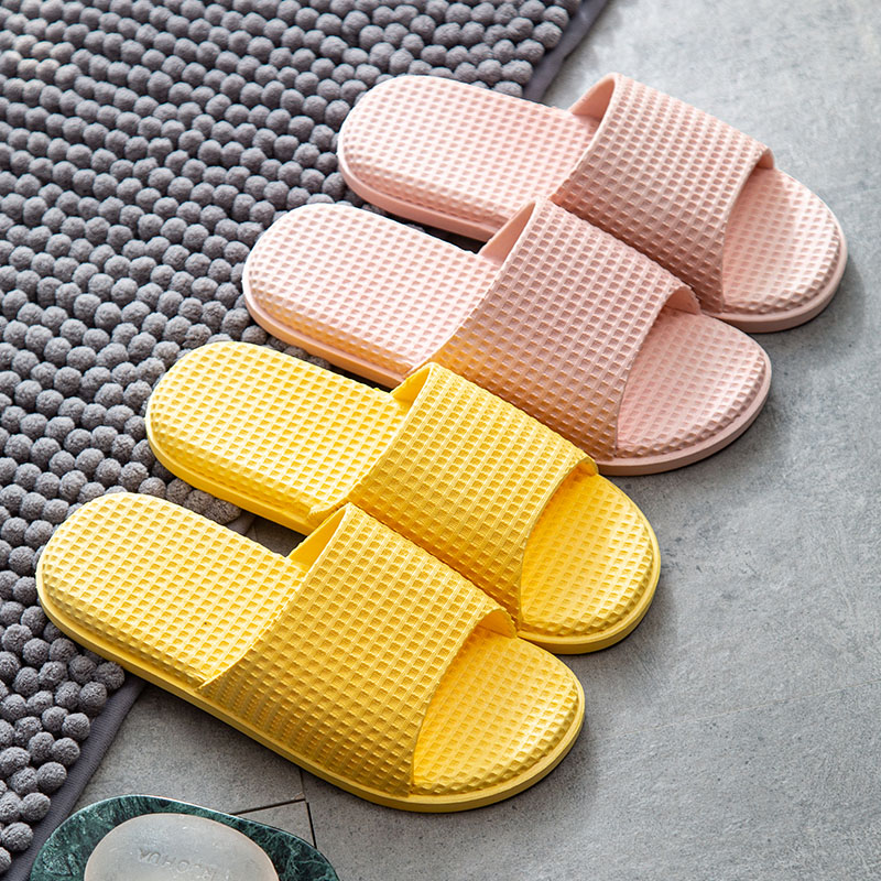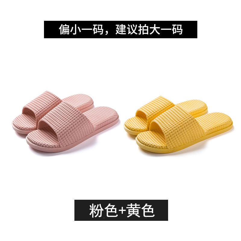 纯色华夫格浴室居家PVC凉拖鞋两双装【PVC/浅粉+黄色】