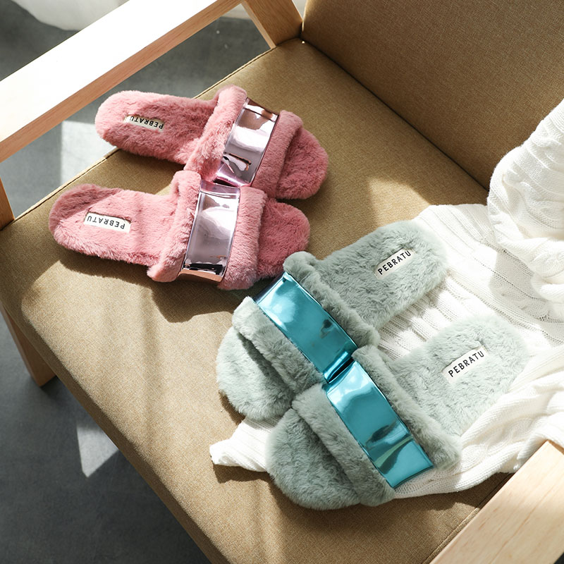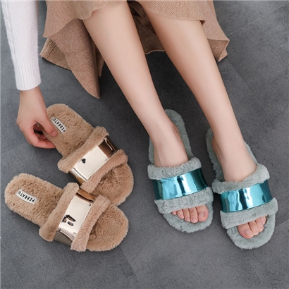 时尚亮片毛绒开口外穿毛拖鞋【短毛绒/浅绿】