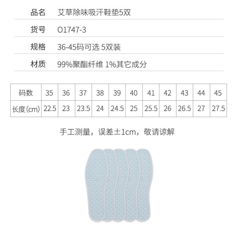 艾草除味吸汗鞋垫5双装【99%聚酯纤维 1%其它成分/图片色】