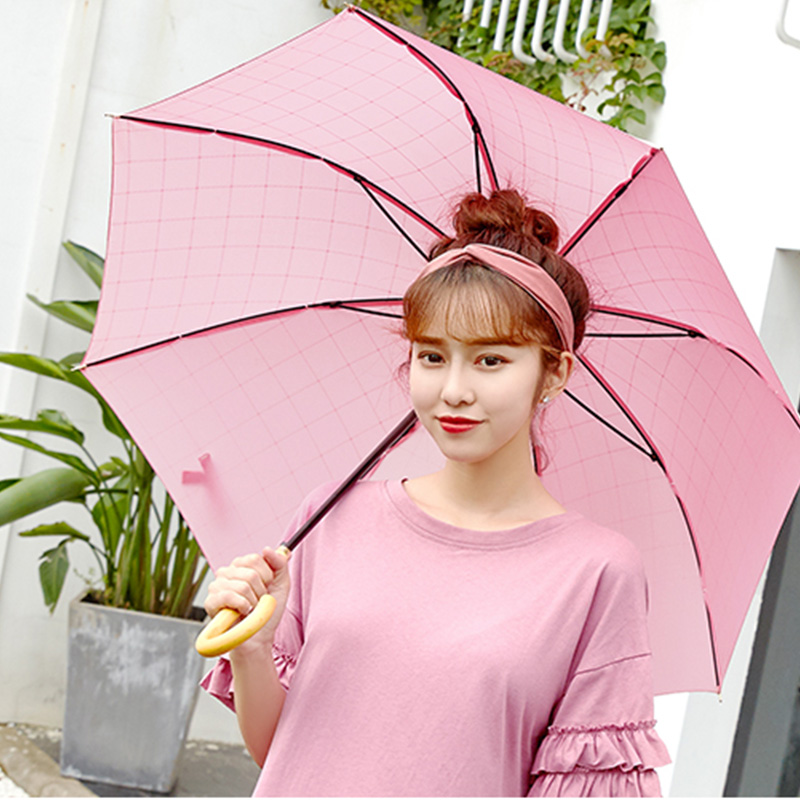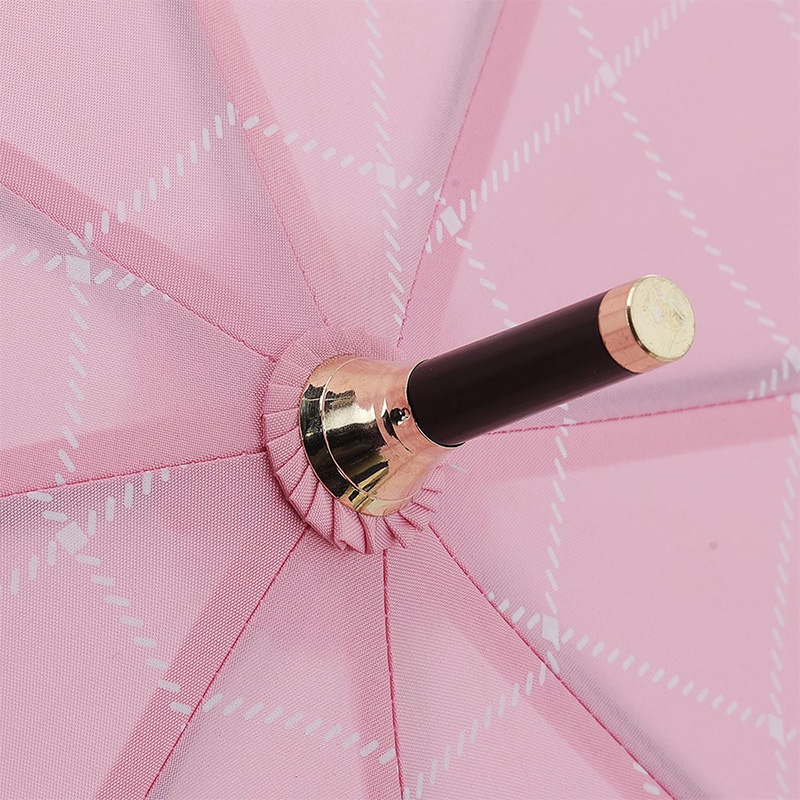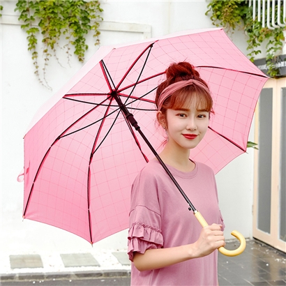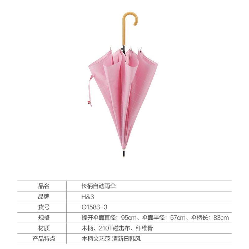 粉色长柄自动雨伞【木柄 210T碰击布 纤维骨/粉色】